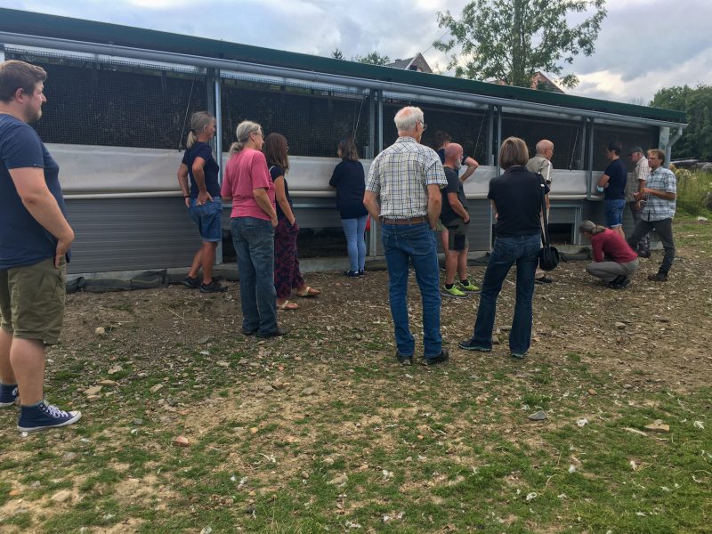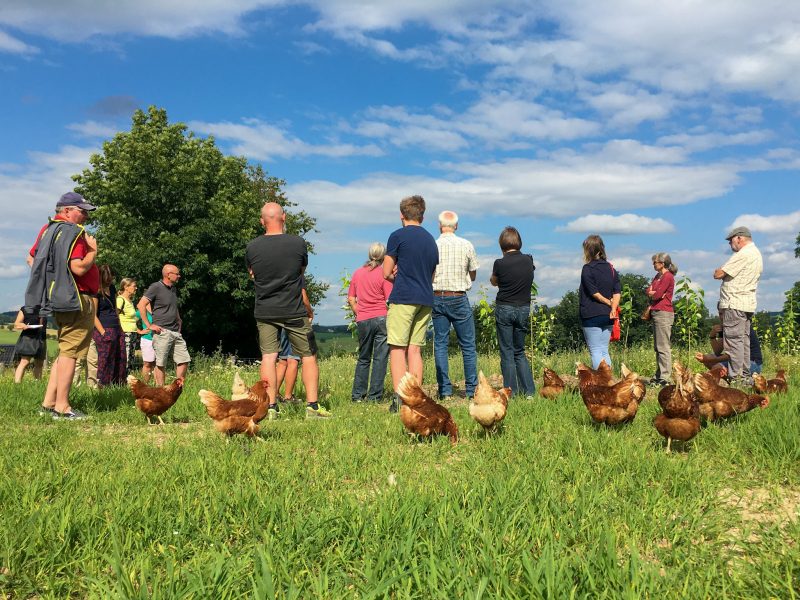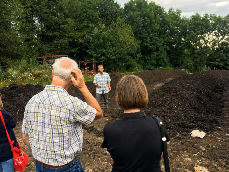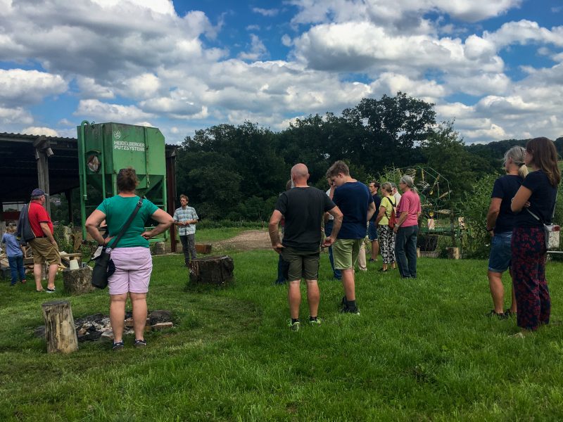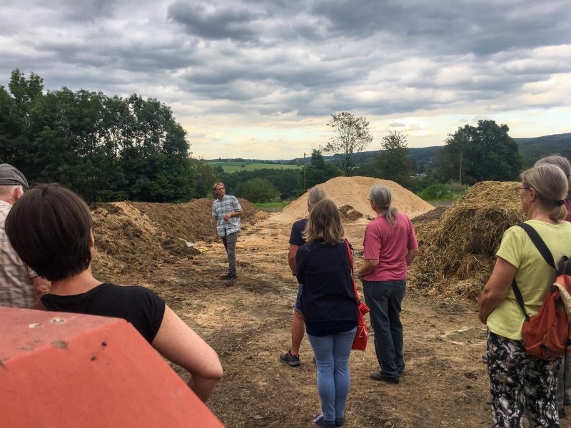 „Im Prinzip geht es bei der regenerativen Landwirtschaft darum, dem Boden und der Natur mehr zu geben als wir nehmen“, sagt der 32-Jährige. Das will er durch eine vielfältige Begrünung seiner Äcker, eine systematische Weidetierhaltung und eine schonende Bodenbearbeitung erzielen. Diese Maßnahmen sollen dazu führen, Kohlenstoff in der Erde zu binden und diese mit Humus anzureichern. Humus ist eine organische Substanz und Nährstoff für zahlreiche Mikroorganismen. Je mehr Humus im Boden enthalten ist, desto fruchtbarer ist dieser. Fünf Prozent sollten es mindestens sein. Doch auf deutschen Äckern liegt der Humusgehalt bei maximal zwei Prozent. Tölkes Böden enthalten 3,7 Prozent Humus. Zwei Stunden schlendert der Landwirt mit den Besucherinnen und Besuchern über seinen Hof und versucht, ihnen seine Vision zu erklären. Organisiert hat die Führung die GRÜNEN Ruppichteroth. „Wir möchten zeigen, dass bei uns Menschen mit Ideen für die Zukunft leben. Gute Lebensmittel zu produzieren und gleichzeitig die Umwelt im Blick zu haben, das muss kein Widerspruch sein“, sagt Karl Hessing, Fraktionsmitglied der GRÜNEN und Beisitzer im Ortsverband Ruppichteroth.