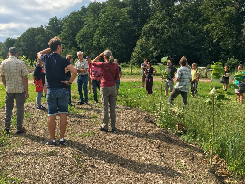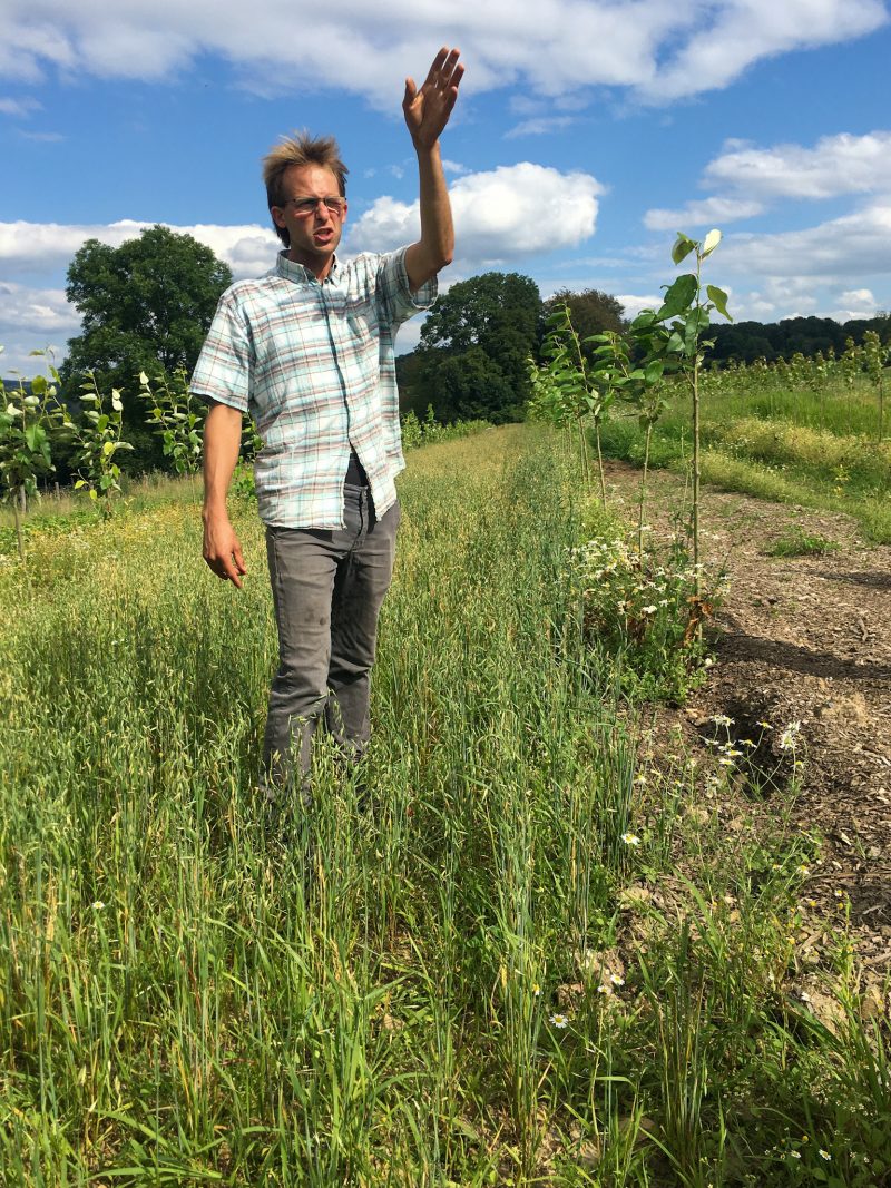 Lukas Tölkes träumt. Von einem Urwald auf seinem Acker in Ruppichteroth. Auf diesem wachsen Bäume, in deren Schatten Rinder grasen. Eine Etage tiefer scharren Hühner in einem Dickicht aus Raps und Wicken. Und wenn es so weit ist, dann fährt Tölkes mit seinem Trecker durch den Dschungel und bringt die Ernte ein. Was sich für Laien nach einem biologischen Wirrwarr anhört, hat System und nennt sich Agroforstwirtschaft. „Dabei kombinieren wir Landwirtschaft, Viehzucht und Forstwirtschaft, um die Artenvielfalt zu steigern und um das Mikroklima und die Bodenqualität zu verbessern“, erklärt Tölkes den 19 Zuhörerinnen und Zuhörern, die auf einem seiner Äcker stehen. Auf diesem hat der Landwirt schon die ersten Pappeln gepflanzt. In Brandenburg gebe es bereits Betriebe, die 800-Hektar-Flächen nach diesem Prinzip bewirtschaften würden. Hier in Ruppichteroth sind die Felder kleiner. Trotzdem denkt Lukas Tölkes groß. In diesem Jahr hat der Bio-Bauer seinen Betrieb auf regenerative Landwirtschaft umgestellt. In fünf Jahren soll Gut Fussberg wirtschaftlich sein.